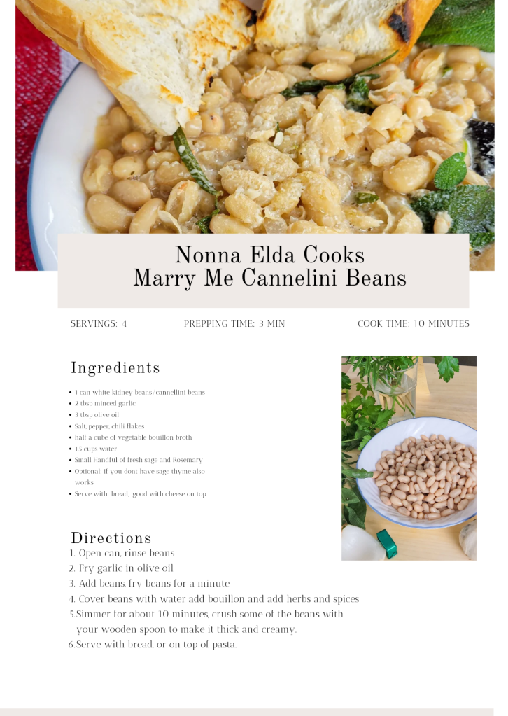 Welcome to our second recipe in Nonna Elda’s recipes for under $10 series! Nonna knows how hard the rising cost of groceries is on everybody and wants all her internet grandchildren to eat well even with less than $10. These absolutely delicious and cosy Marry-Me Cannellini beans are perfect and budget conscious.