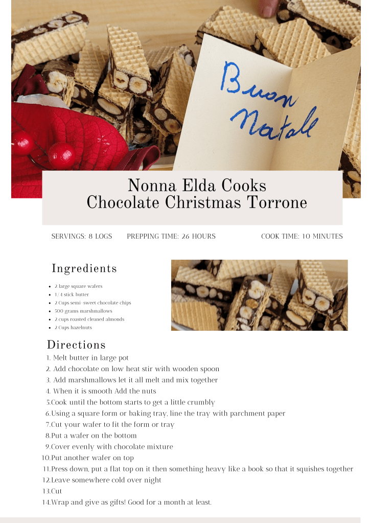 Chocolate Torrone is a family favourite in Italian households all over the diaspora. It’s easy to make it requires no baking and the recipe is enough for 8 logs that keep well for a month when kept somewhere cool and wrapped. This is the perfect gift to make for when visiting friends and family over the holiday.